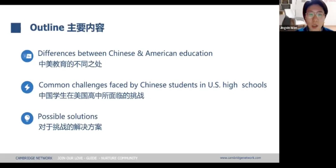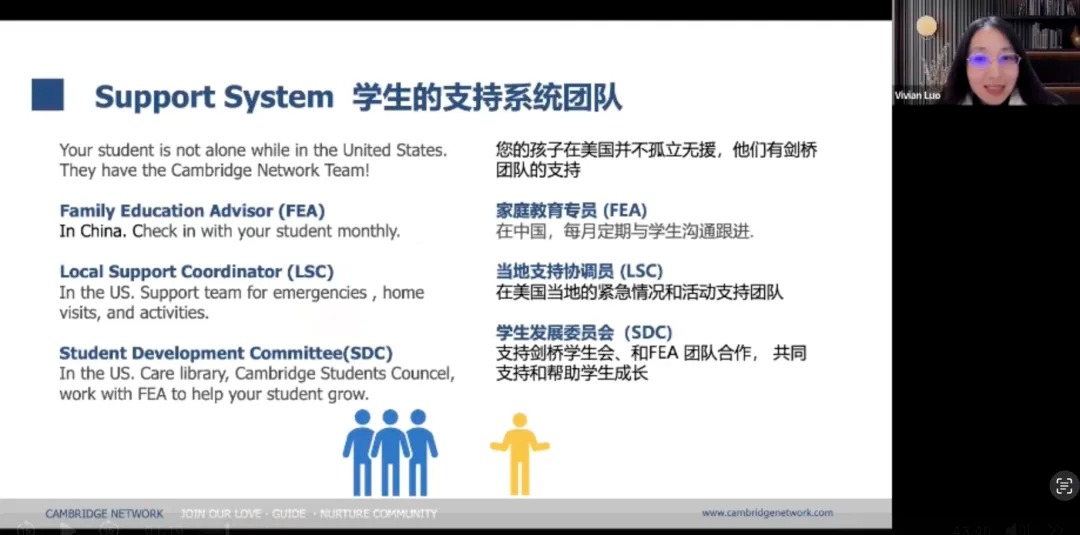 本次新生指导会上,剑桥美国高中联盟从多方面为新生及其家长进行了详尽讲解,包括剑桥为学子提供的全面支持体系、美高学术实况、出国前的全面准备&寄宿家庭的相处之道,赴美前的实用信息、沟通指南及冲突解决案例分析,学生的保险以及剑桥优秀学子经验分享等内容。我们期待通过全面的板块、专业团队的深入阐释、在美学长的亲身经历传授,协助每一位学生与家长做好充足的准备,以迈出赴美求学的坚实的第一步!