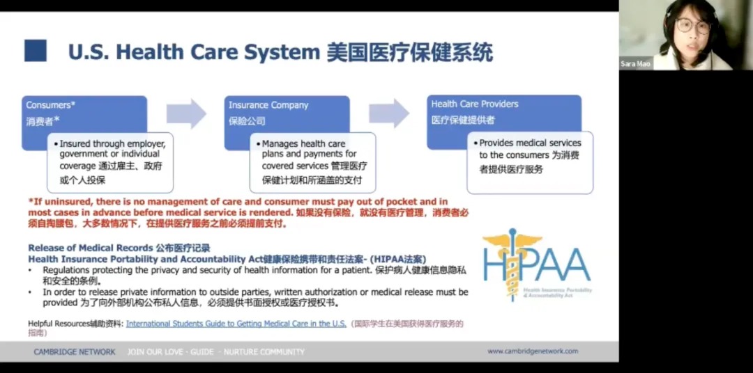 剑桥FEA老师为家长及学子们详细介绍了美国的医疗保健系统的信息、学生保险的保障范畴、赔付范畴及赔付流程。
